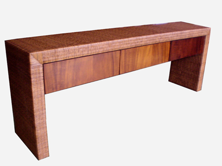 APARADOR DE MADEIRA REVESTIDO COM FIBRA NATURAL JUNCO E COM 3 GAVETAS .