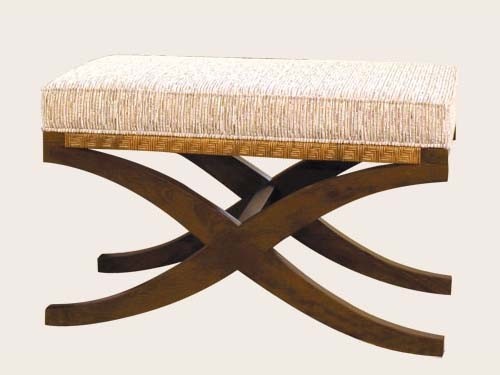 PUFF DE MADEIRA IMBUIA COM DETALHES EM FIBRA NATURAL JUNCO E ALMOFADA.