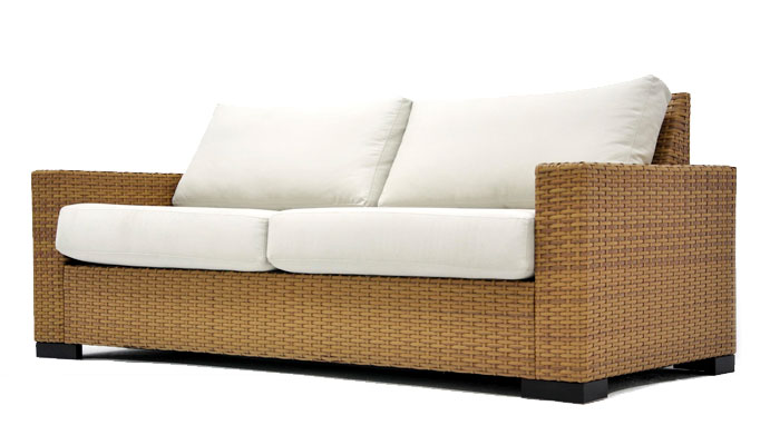SOFÁ COM ESTRUTURA EM ALUMINIO E REVESTIDO COM FIBRA SINTÉTICA, TECIDO A ESCOLHER DAS ALMOFADAS. medidas L 2.00x P 0.90x 0.82 altura