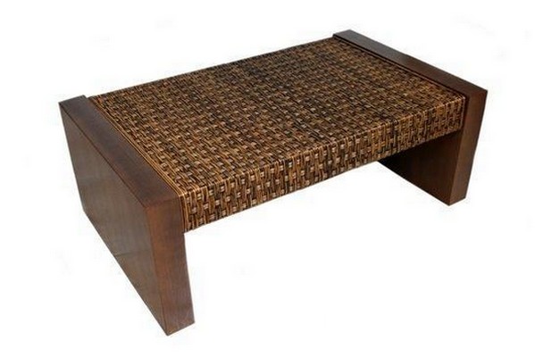 MESA DE CENTRO DE MADEIRA COM DETALHES DE FIBRA NATURAL JUNCO.